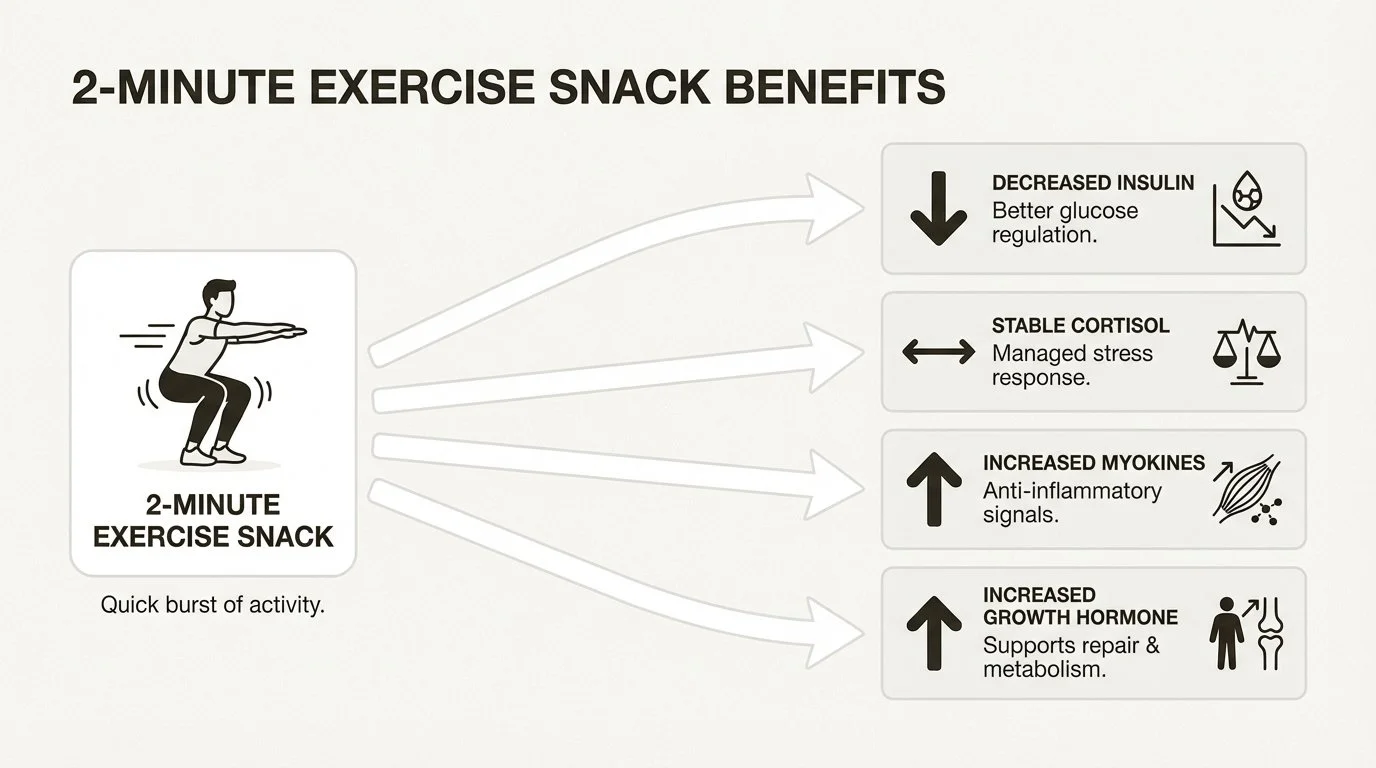 For people dealing with insulin resistance or prediabetes, this is significant. Exercise snacks help pull glucose into muscle tissue without requiring as much insulin, which means lower post-meal spikes and better metabolic flexibility over time.
